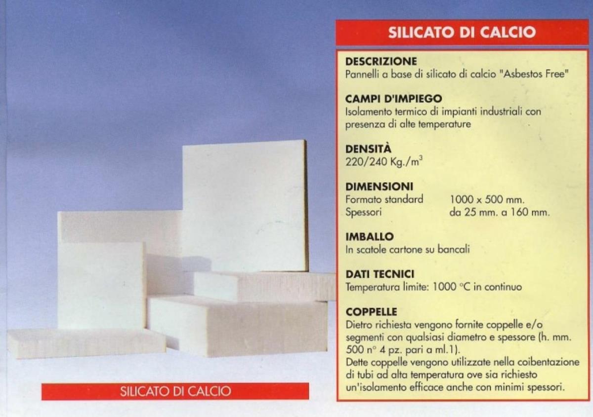 Prodotte in un moderno impianto con un processo produttivo unico nel suo genere, le lastre isolanti in calcio silicato per alta temperatura, assicurano oggi una delle soluzioni migliori nel campo della coibentazione per le elevate caratteristiche termo-fisiche, favorevole rapporto tecnico-economico e, non ultimo, sotto il profilo della sicurezza in materia ambientale e della salute dell’uomo. Queste lastre di calcio silicato risultano estremamente compatte, autoportanti e leggere allo stesso tempo e resistono a temperature sino a 1000°C in continuo.
